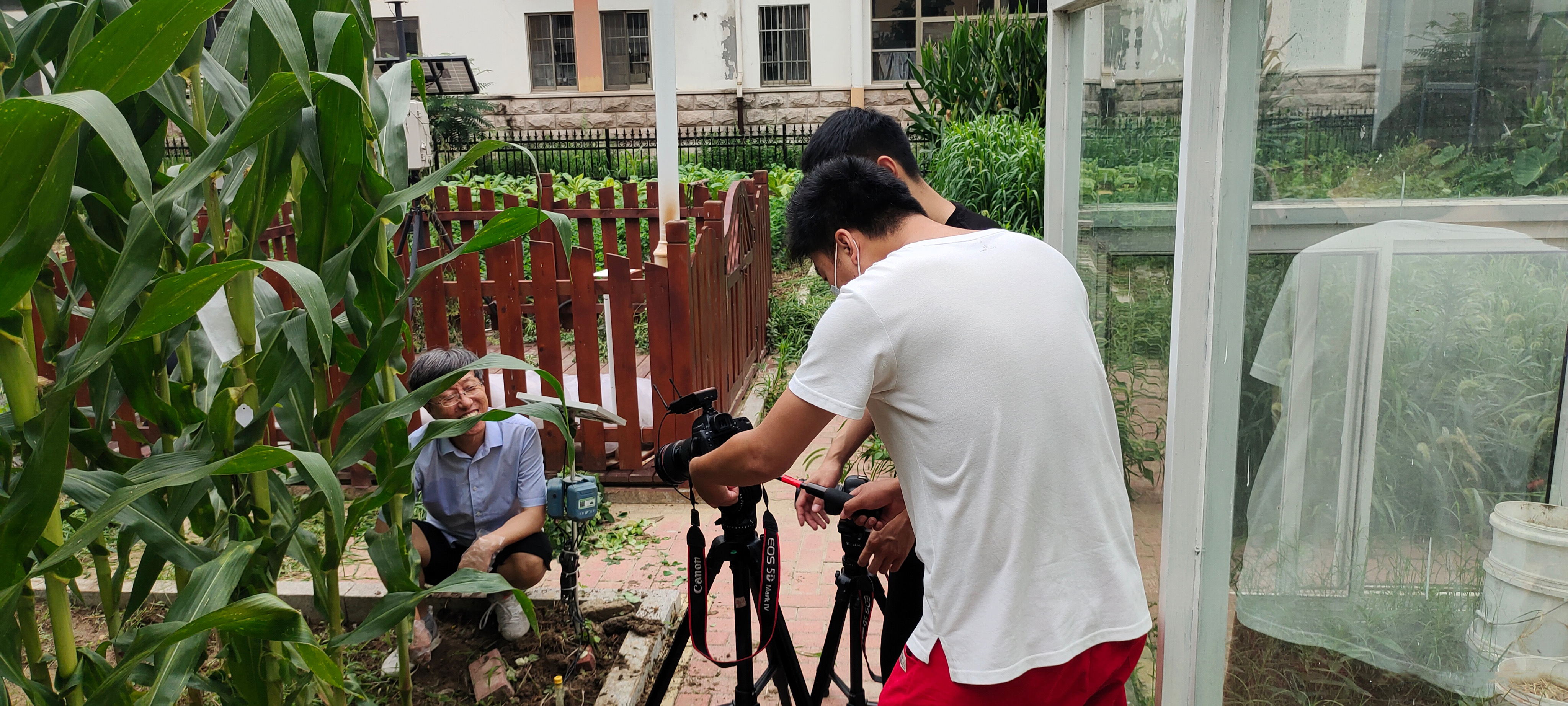 7月11日,澳门十大网投正规官网平台教授杨锦忠在作物认知园进行玉米花粒期栽培实验视频拍摄工作。拍摄前,他根据场景需要,选择有代表性的玉米植株,与导演和摄影师交流成片的要求,确定分镜机位,为了达到理想的效果往往需要重复拍摄几次。尽管天气炎热,杨锦忠还是坚持拍摄完了玉米花粒期田间素材。暑假期间,项目团队各位专业教师克服疫情困难,冒酷暑抢农时,如期开展水稻、玉米、大豆等作物的实验课视频录制。