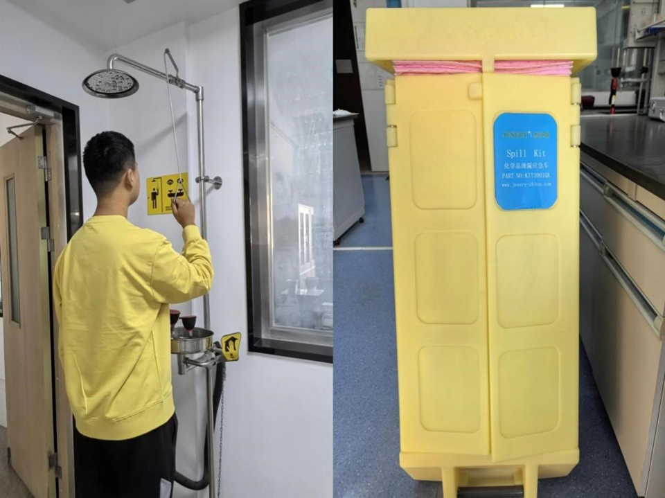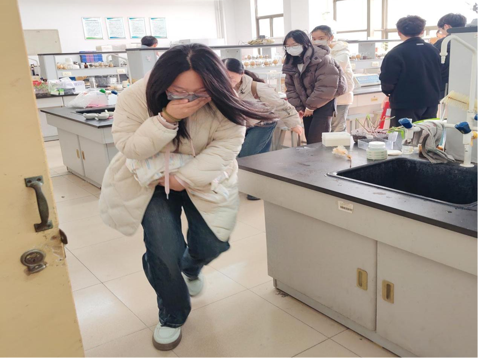 安全演练在教学实验室与科研实验室同步开展,聚焦化学品泄漏、电器设备起火、酒精灯火灾等常见高风险场景,覆盖化学品泄漏、电器设备故障起火、酒精灯着火等高频风险场景。在教学实验室演练中,由裴玉贺、王维华老师指导,针对学生在实验过程中出现电器故障起火进行应急演练,模拟电泳仪电源设备因线路老化短路引发火情,伴随浓烟产生。现场实验人员第一时间发现险情,立即按下紧急断电按钮,切断设备总电源,同时高声呼救并通过拨打电话向演练指挥部上报,明确告知起火位置、火势大小及是否有人员被困。接到报警后,应急处置小组迅速响应,赶赴现场。安全员根据起火设备类型,选择适配的二氧化碳灭火器,按照“提、拔、握、压”规范操作流程,对准火源根部精准喷射;辅助人员同步使用灭火毯覆盖周边易燃设备,防止火势蔓延。期间,现场设置警戒区域,专人引导参与师生弯腰低姿、捂住口鼻,沿安全疏散通道快速有序撤离至指定集合点。