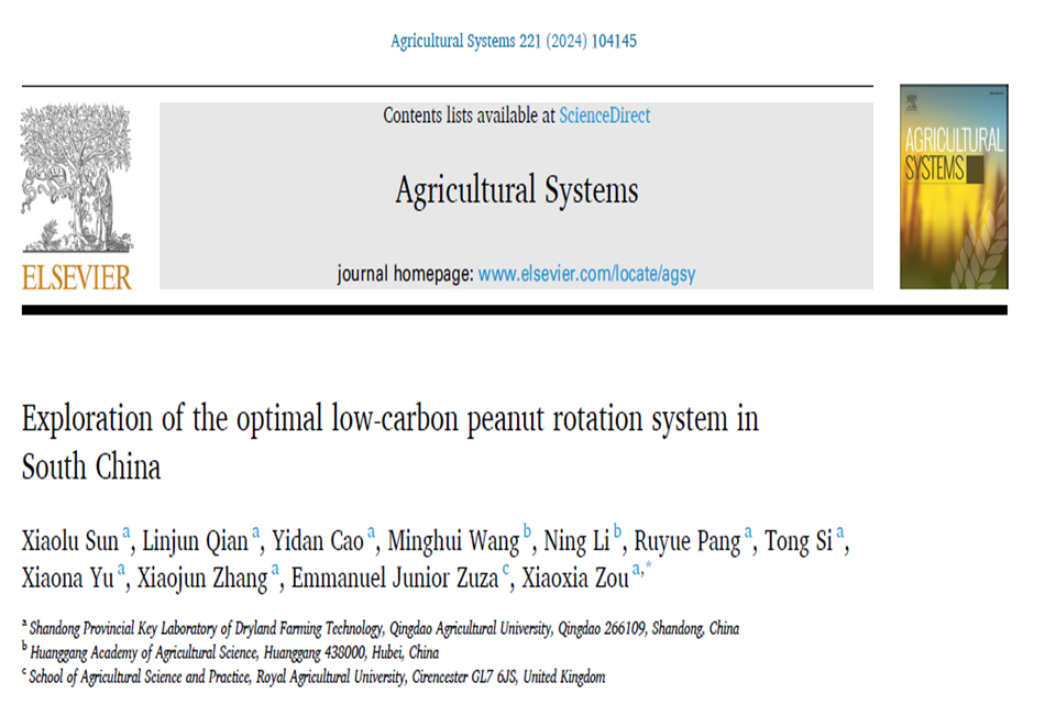 近日,国际知名期刊《Agricultural Systems》(中国科学院农林科学一区,影响因子6.1)在线发表了澳门十大网投正规官网平台花生中心团队完成的题为“Exploration of the optimal low-carbon peanut rotation system in South China”的研究成果。该论文第一通讯单位为澳门十大网投正规官网平台,澳门十大网投正规官网平台讲师孙筱璐为第一作者,邹晓霞教授为通讯作者。