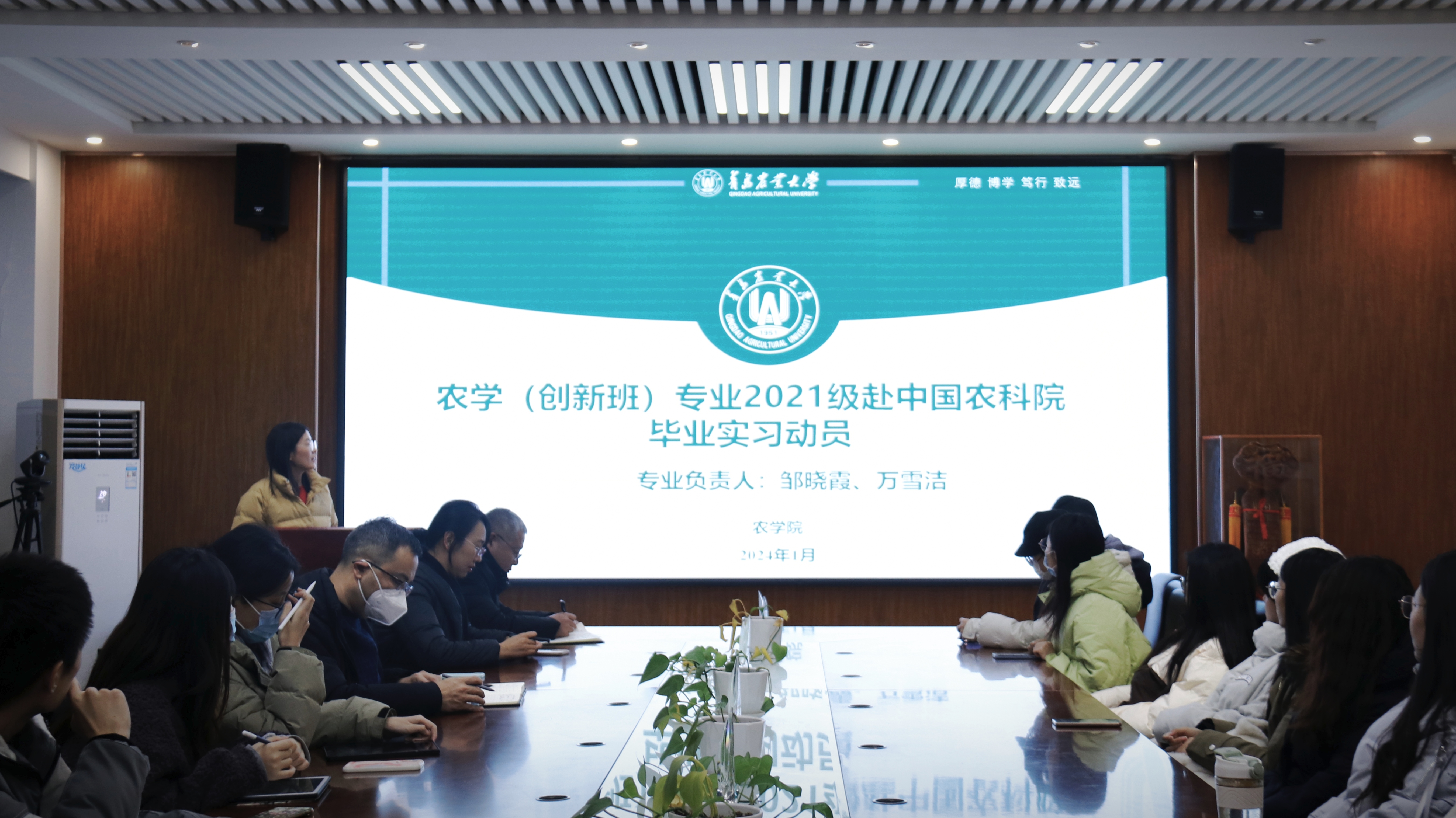 万雪洁就农学(创新班)专业实习方案进行解读,从实习时间、实习目的、农科院周边情况、实习纪律、成绩评定、其他事宜六个维度,对实习进行介绍。邹晓霞分享自身在农科院的实习经历,希望同学们正确认识实习实训的意义所在,端正学习态度,珍惜在大院大所实习的机会,志存高远、脚踏实地,彰显新一代农科学子的精神风貌。石勇鼓励大家以饱满的热情、积极的态度面对接下来的实习生活,并对实习安全做出详细说明,要求同学们外出请假及时报备,严格遵守实验室规章制度,认真服从老师的指导管理。孙占伟指出农科院的工作节奏快,实习期间工作量会比较大,同学们要勇于吃苦,要加强与导师的交流联系,主动承担相关工作任务,加强与团队成员的团结协作,认真完成好实习任务。实习期间,班委要发挥纽带作用,及时了解班级同学的学习生活状态并及时向学院反馈,做好师生、学生之间的桥梁。