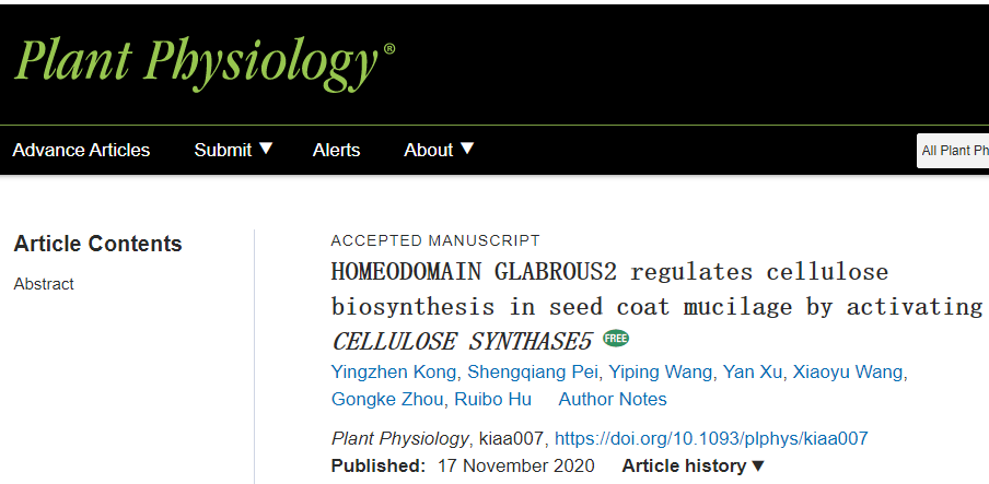 近日,澳门十大网投正规官网平台资源植物与环境工程创新团队成员澳门十大网投正规官网平台孔英珍教授及其合作者首次发现了拟南芥种皮粘液质中调控纤维素合成的转录因子HDG2,揭示了其在种皮粘液质中参与纤维素合成转录调控的分子机制。相关研究内容『HOMEODOMAIN GLABROUS2 regulates cellulose biosynthesis in seed coat mucilage by activating CELLULOSE SYNTHASE5』于11月17日在线发表在《Plant Physiology》(中科院分区:1区,期刊影响因子:7.1)上(原文链接:https://academic.oup.com/plphys/advance-article/doi/10.1093/plphys/kiaa007/5985557)。