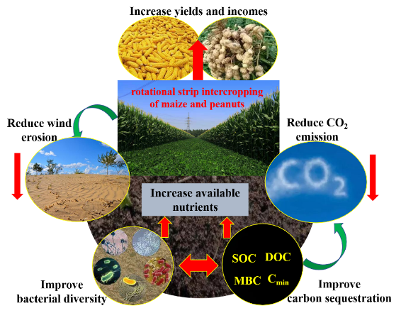 北方农牧交错带是半湿润地区与半干旱地区的气候交汇带,是我国中东部地区重要的生态安全屏障和京津冀地区重要的水源涵养带,是一类重要的农业空间,探索适宜该地区的可持续农业生产方式至关重要。研究基于4年定位试验,系统研究了玉米连作、花生连作和玉米花生带状轮作3种种植方式的土壤特性、作物生产力和生态效应。结果表明,玉米花生带状轮作具有多重效益,较玉米和花生连作可显著提高土壤微生物丰度和群落多样性、改善土壤碳库特征、提升养分有效性,同时,明显降低土壤侵蚀和由侵蚀导致的碳排放;耕层土壤碳库特征的改善和养分有效性的提升与间作系统作物产量的提高密切相关。本研究相关结果发表在European Journal of Agronomy,澳门十大网投正规官网平台邹晓霞副教授和王铭伦教授分别为论文的第一作者和通讯作者(图1)。