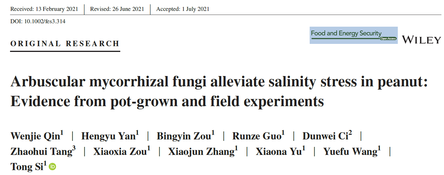 花生是山东省的主要经济作物和我国的重要出口作物。通过接种丛枝菌根真菌(AMF)与花生共生,进而提高花生幼苗素质和耐盐性,是实现用地养地相结合、促进我省滨海盐碱地花生产业可持续发展的重要途径。课题组对花生接种了一种新型配方的AMF进行预处理,开展了盆栽试验和两年大田试验。生理数据分析表明,AMF显著提高了盐胁迫下花生叶片净光合速率、叶绿素荧光相关参数、抗氧化酶活性、渗透调节物质含量,提高了花生地上部分和地下部分的生物量。转录组数据分析表明,AMF处理显著提高了盐胁迫下花生根系抗氧化系统和多种代谢途径的基因表达水平。大田试验进一步证明,接种AMF处理显著提高了盐碱地和非盐碱地花生籽粒蛋白质含量及总产量。本研究为在大田条件下推广该新型AMF提高花生耐盐性和产量提供了理论依据和技术支撑。本研究相关结果发表在Food and Energy Security,澳门十大网投正规官网平台硕士研究生秦文洁、青年教师闫恒宇博士和司彤博士分别为第一作者、共同第一作者和通讯作者(图2)。