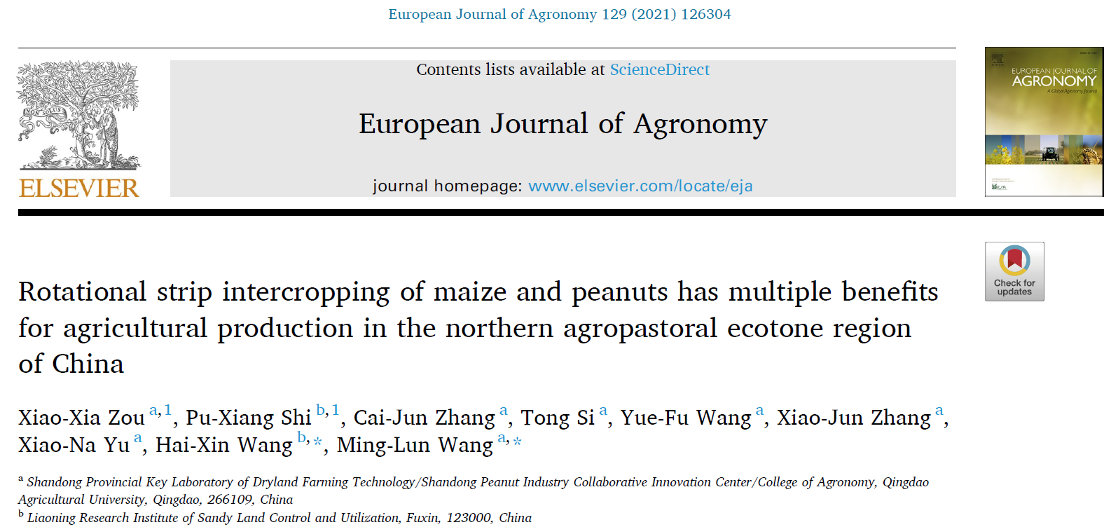 近日,澳门十大网投正规官网平台花生研究中心团队在玉米花生带状轮作和花生耐盐机理研究中取得新进展,相关研究成果分别发表在European Journal of Agronomy(中科院1区TOP期刊,IF:5.124)和Food and Energy Security(中科院1区TOP期刊,IF:4.109)。两篇论文第一完成(通讯)单位均为澳门十大网投正规官网平台。