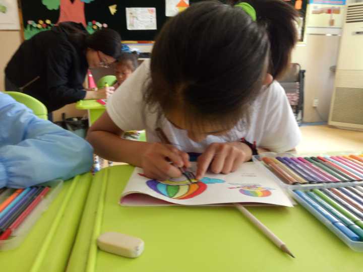 到达特教中心,一张张洋溢着欢乐的面孔展现在我们面前。我们接管的是三年级,特教中心负责人把我们带入教室,小朋友们用热烈的掌声欢迎我们。第一堂课是教小朋友们画画,彩色的铅笔在纸上挥舞,每一幅画都怀揣着孩子们对未来的憧憬。第二堂课,我们教小朋友们学了手指舞“为中国点赞”,孩子们认真学习动作,舞动着稚小的手指,欢乐容容。不知不觉时间就过去了,我们的任务圆满完成,到了离开的时候,我们为小朋友送上了爱心祝福。
