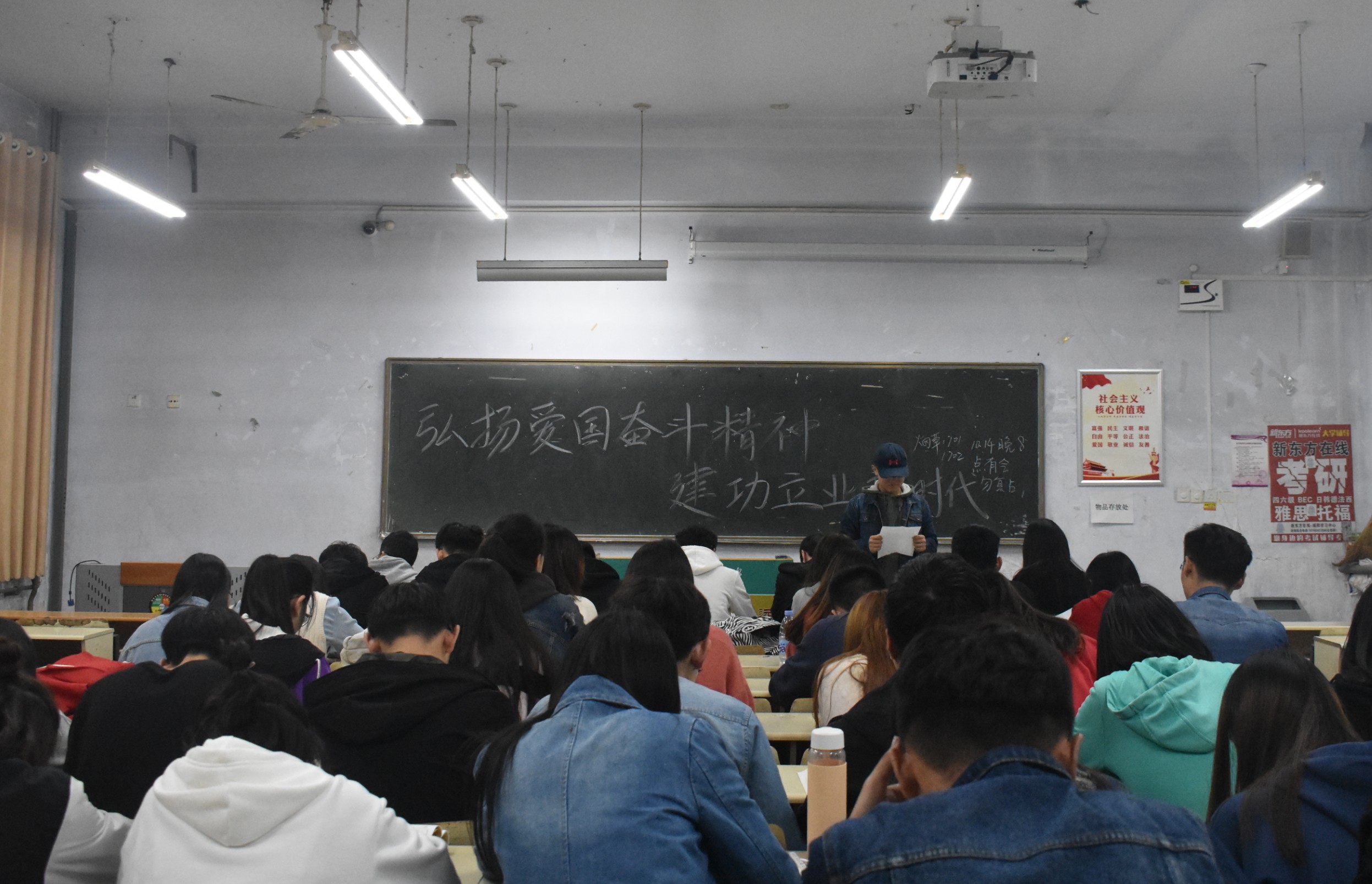 为深入贯彻落实习近平总书记对广大青年提出的希望与要求,增强同学们的爱国情怀,争做新时代新青年,10月14日,澳门十大网投正规官网平台于教学区开展"弘扬爱国奋斗精神,建功立业新时代"主题团课教育,2017、2018级全体同学积极参加。