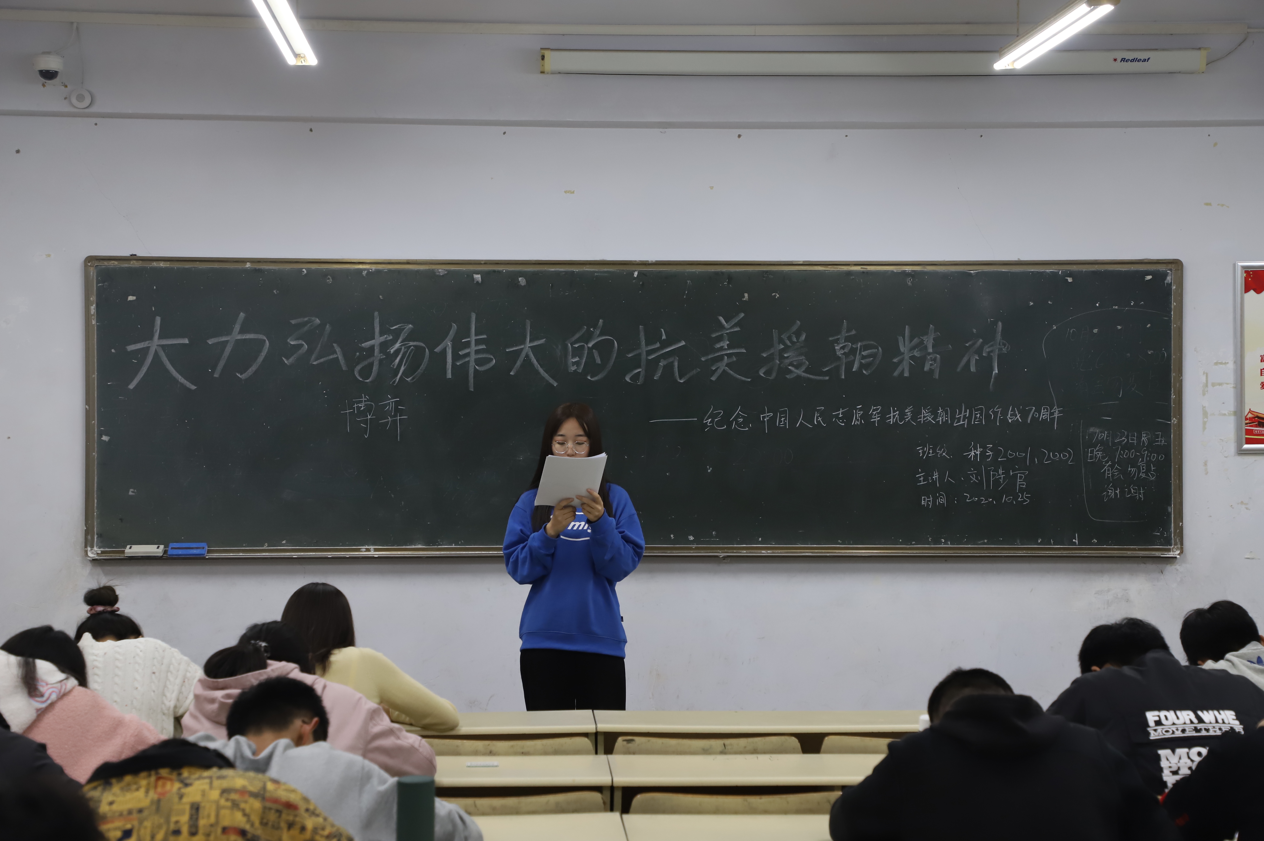10月25日,澳门十大网投正规官网平台于教学区开展“大力弘扬伟大的抗美援朝精神”主题团课,旨在纪念抗美援朝胜利70周年,铭记历史,致敬英雄,弘扬爱国主义精神。2019级、2020级全体学生积极参加。