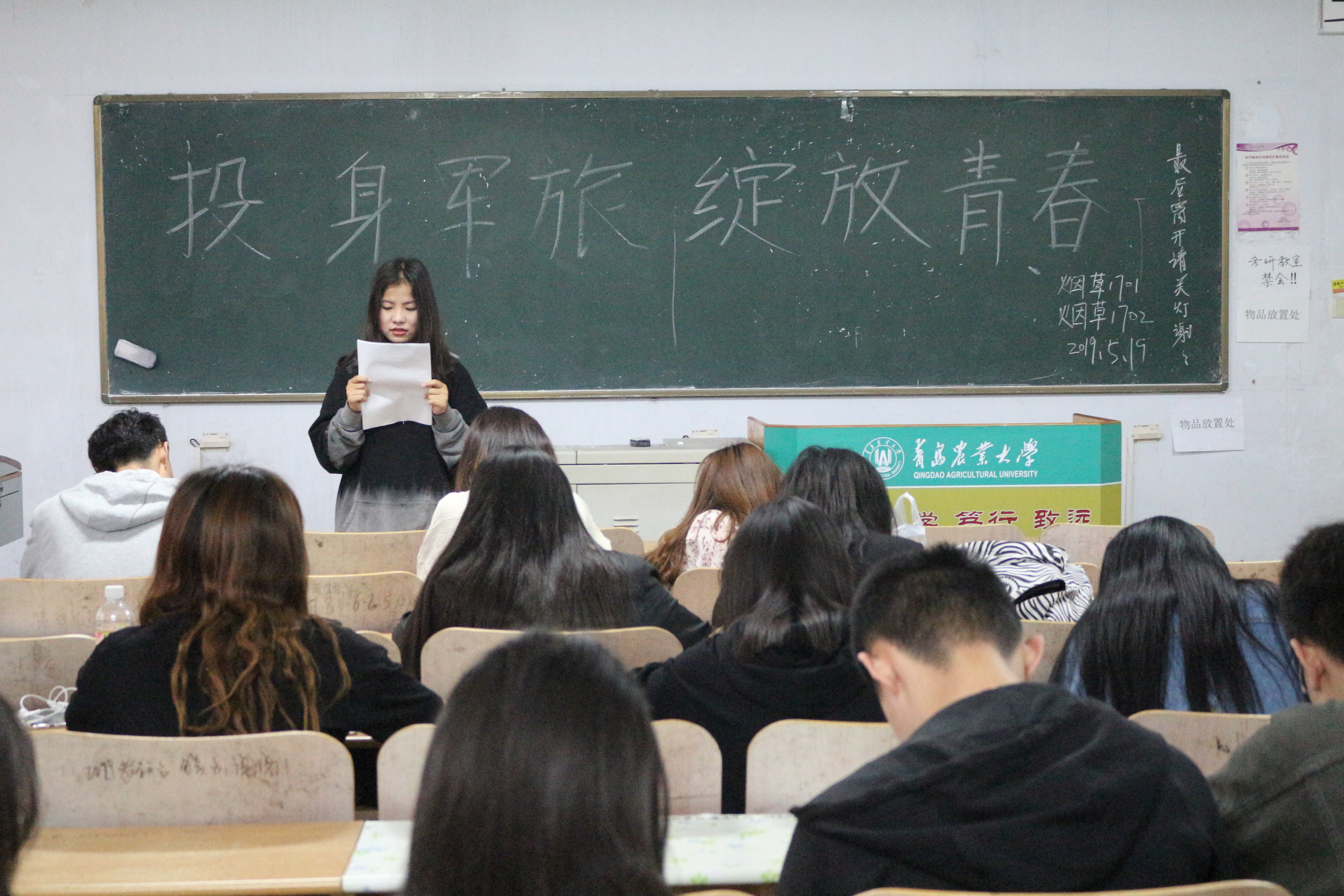 为响应习近平总书记提出的强军兴军伟大号召,鼓励当代大学生在军营中磨炼自我,5月19日,澳门十大网投正规官网平台于教学区开展“投身军旅,绽放青春”主题团课,学院2017、2018级全体同学积极参加。