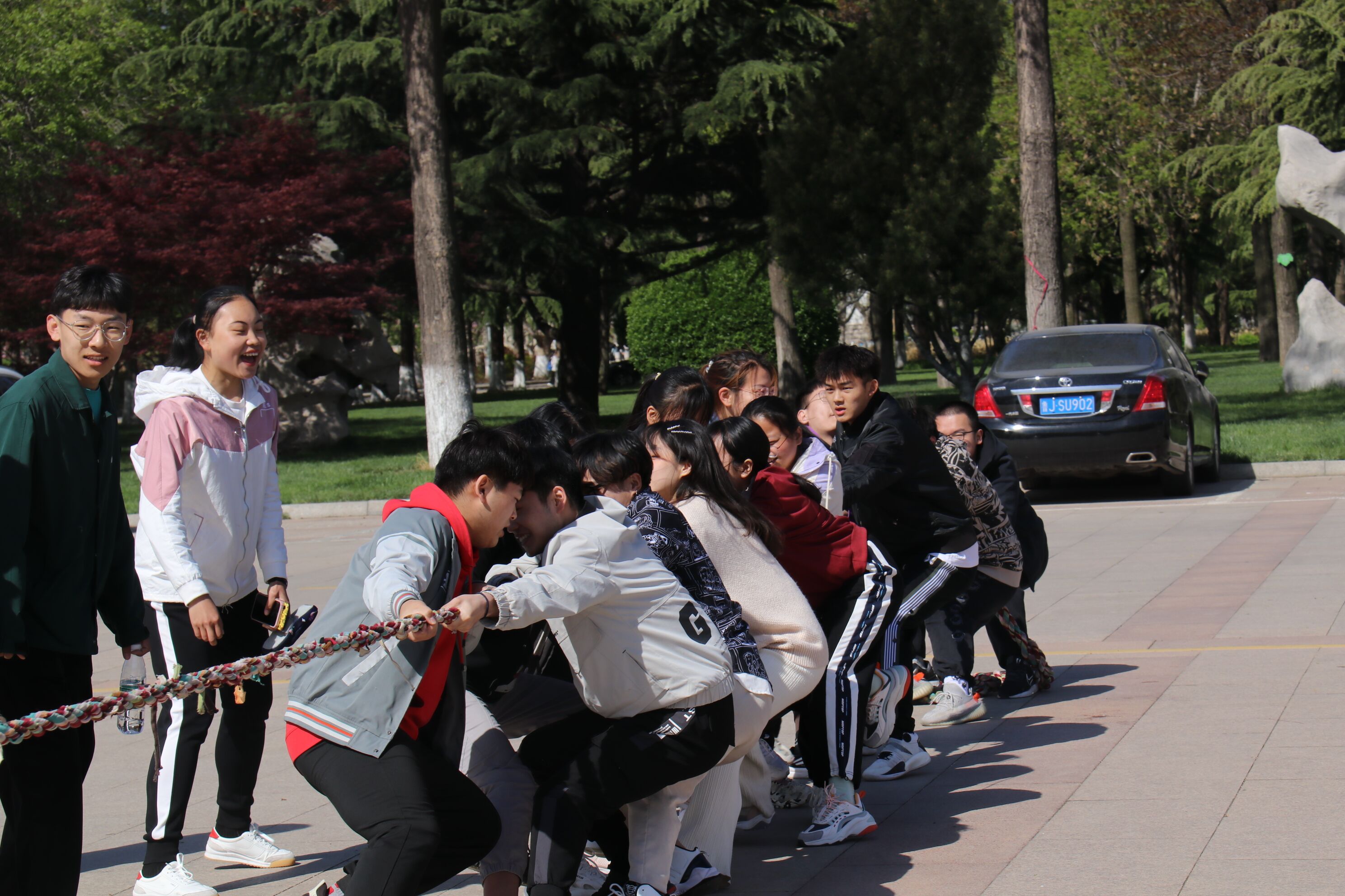 比赛还未正式开始,同学们在虹子广场上做着赛前热身,摩拳擦掌,跃跃欲试,欢声笑语一片。裁判的一声哨音适时响起,趣味运动会正式开始。拔河比赛作为首发项目,竞争尤为激烈,场下观众高声呐喊,为自己的队伍加油打气,现场气氛十分热烈。随后的绑腿跑项目,趣味横生,既锻炼了参赛选手的平衡力,又考验了他们的赛跑能力。比赛中,同学们积极投入,精神抖擞,热情高涨,充分展现出团结进取、蓬勃向上的精神风貌。虹子广场上笑声不断,洋溢着20级学生们的热情。时间飞速流逝,趣味运动会接近尾声,全体参赛班级来到虹子广场前合影留念。