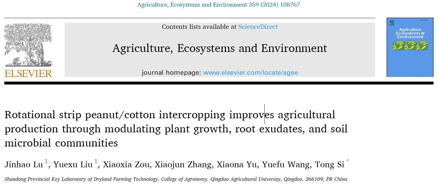 近日,国际知名期刊《Agriculture, Ecosystems & Environment》(中科院一区,影响因子6.6)在线发表了澳门十大网投正规官网平台花生研究中心团队完成的题为“Rotational strip peanut/cotton intercropping improves agricultural production through modulating plant growth,root exudates, and soil microbial communities”的研究成果。该论文唯一通讯单位为澳门十大网投正规官网平台,澳门十大网投正规官网平台硕士研究生鹿锦浩和刘悦旭分别为第一作者和共同第一作者,司彤副教授为通讯作者。