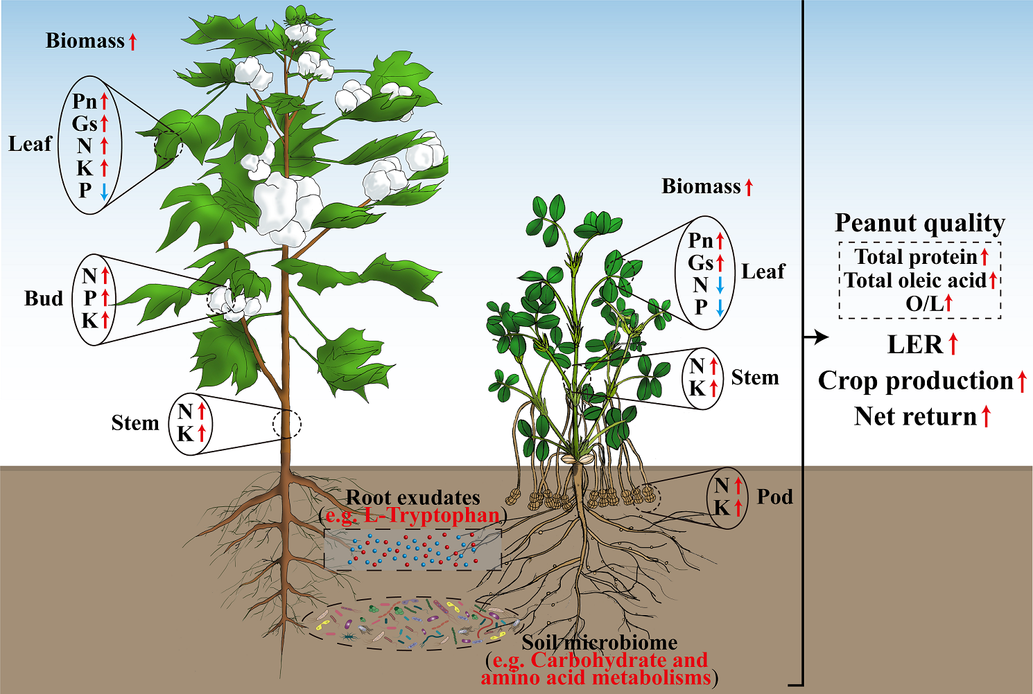 花生和棉花是山东省的重要经济作物。开展间作轮作种植模式能够有效缓解花生连作障碍,实现用地养地相结合,促进农业可持续发展。本研究采用花生棉花“等幅间作交替轮作”种植模式,通过五年的大田定位试验,同时结合根系分隔处理,表明该种植模式能够显著促进各生育时期花生棉花植株生长,增强棉花叶片的净光合速率,促进干物质积累。根系分泌物的代谢组学分析表明,以前体物质色氨酸为代表的生长素合成途径相关物质显著富集。同时,间作处理还提高了根际土壤细菌群落多样性,碳水化合物和氨基酸代谢相关优势功能微生物显著积累。综合五年数据表明,该种植模式显著提高了棉花产量和经济效益,提高了花生籽仁蛋白质含量、油酸含量和油亚比。